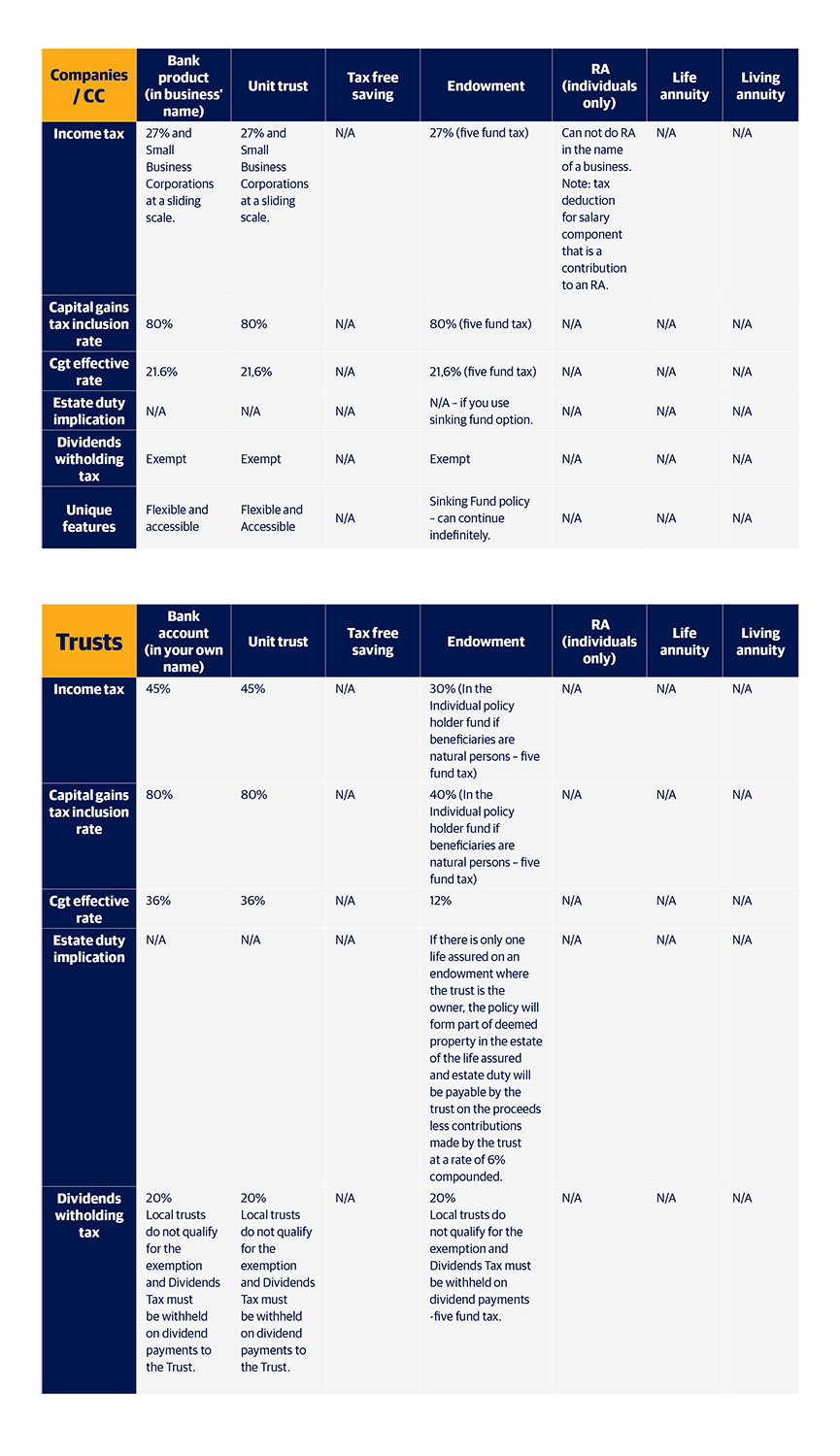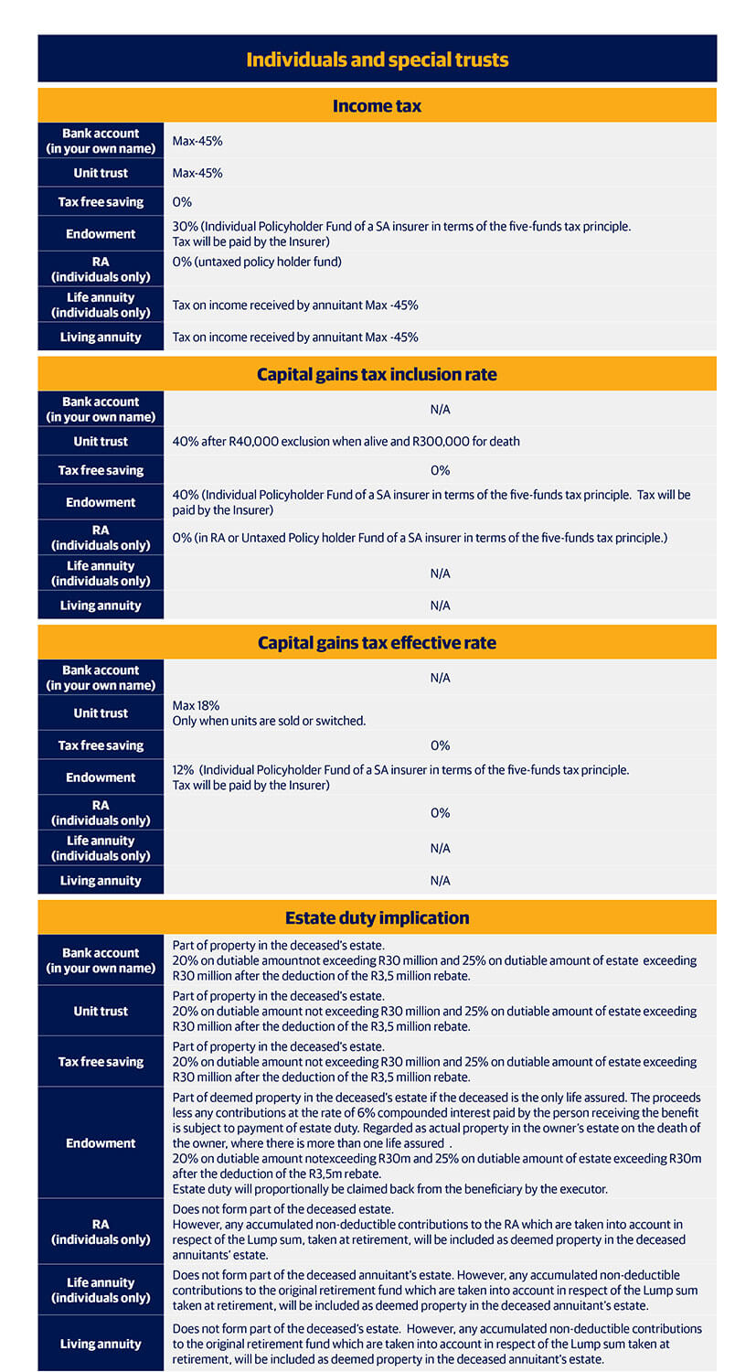 Taxes and Estate duty payable on all types on Investment products for different entities